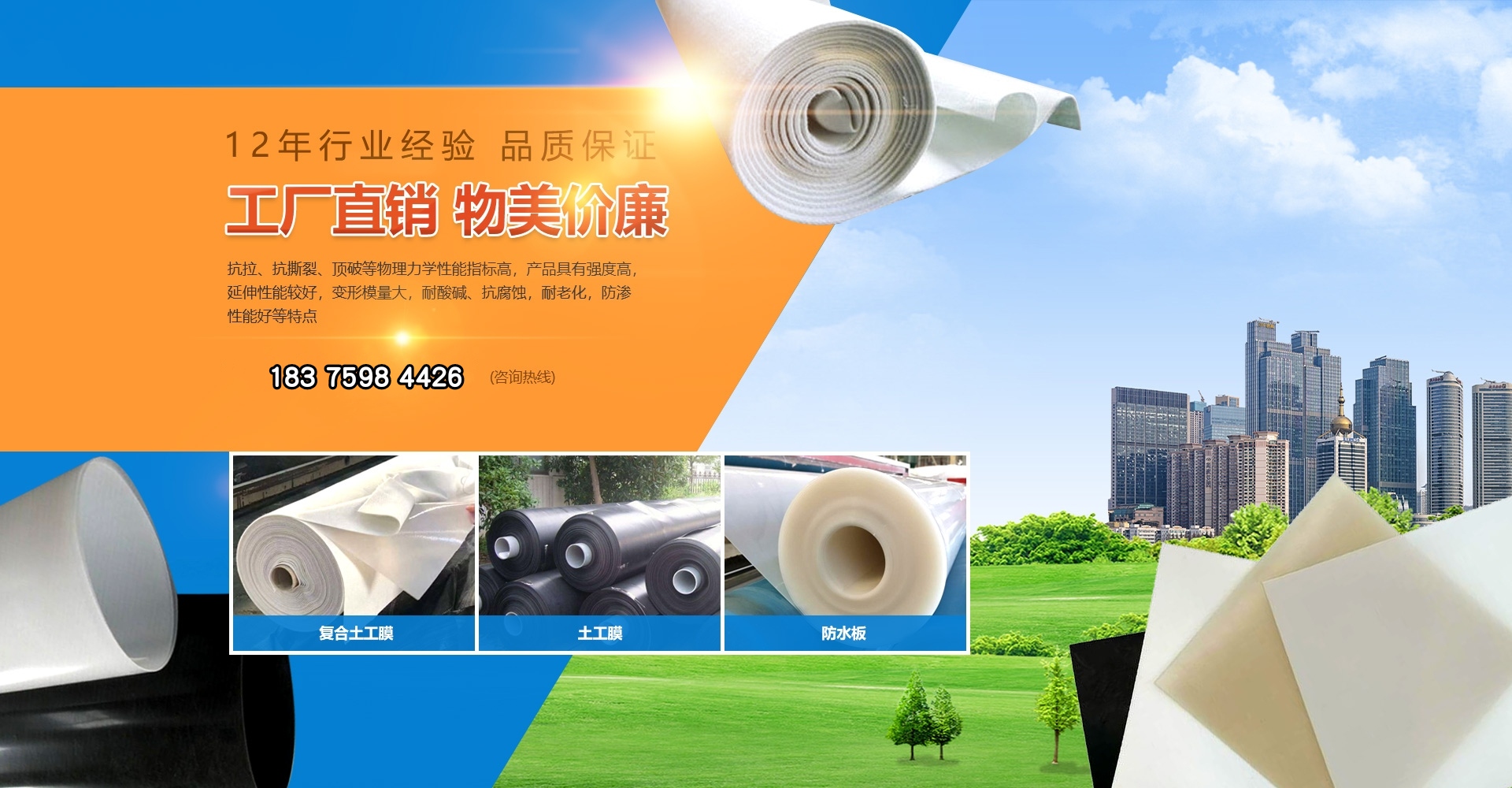 復合土工膜分為一布一膜和兩布一膜,寬幅4-6m,重量為200—1500g/平方米,抗拉、抗撕裂、頂破等物理力學性能指標高,產品具有強度高,延伸性能較好,變形模量大,耐酸堿、抗腐蝕,耐老化,防滲性能好等特點。能滿足水利、市政、建筑、交通,地鐵、隧道、工程建設中的防滲、隔離、補強、防裂加固等土木工程需要。常用于堤壩、排水溝渠的防滲處理,以及廢料場的防污處理。