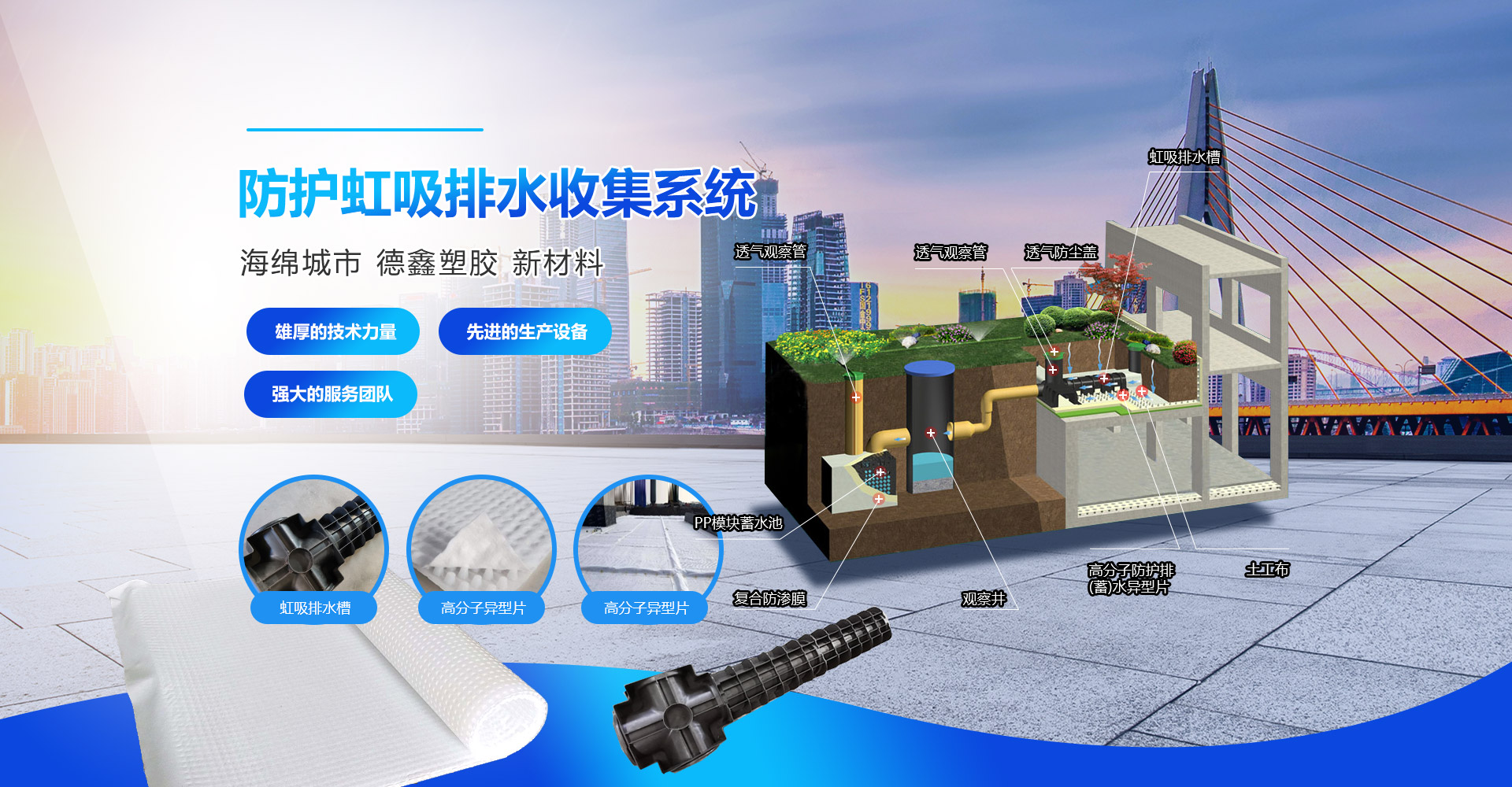 虹吸排水系統 雨水收集系統 PP蓄水模塊 土工膜 復合土工膜 防水板 塑料盲溝管 防排水板 蓄排水板 土工布 土工格柵 土工格室 溢水格柵 生態袋 土工席墊 植草格 植草盆 線性排水溝 萬能支撐器 三維植被網